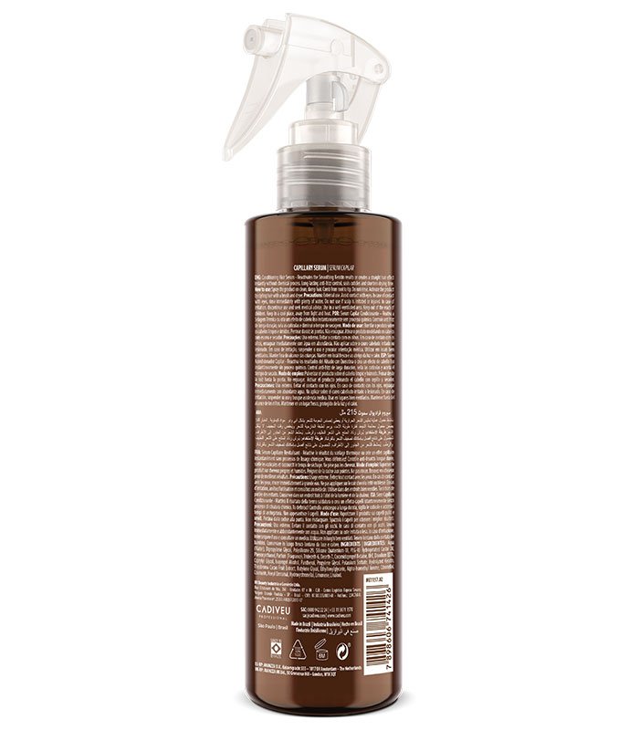 Image of the Cadiveu Brazil Cacau Gradual Smooth Serum bottle, with 215 ml. The label highlights ‘memory effect’ and ‘instant smooth effect’, in a brown package with a clear spray.