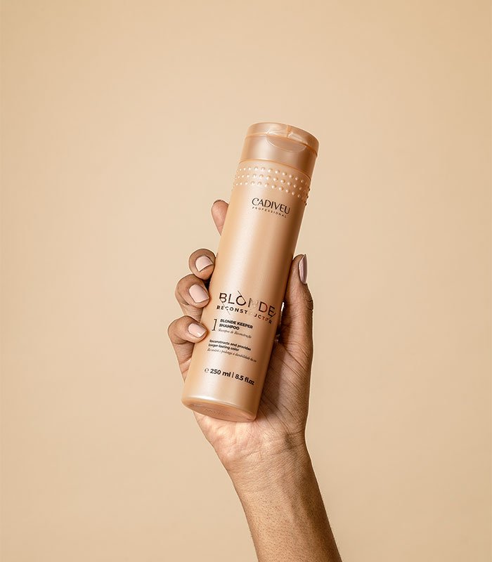 Beige cylindrical bottle with textured details near the cap, containing Cadiveu Professional Blonde Reconstructor shampoo. The label features the brand logo, product description, and a capacity of 250ml (8.5fl.oz). Recommended for reconstructing and extending the durability of blonde hair color.