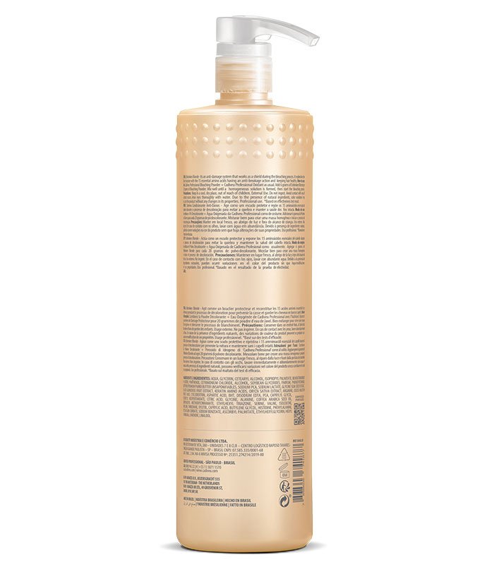 Photograph of a 1-liter bottle of Cadiveu Professional Blonde Reconstructor Unbroken Blonde. The container is golden with a dotted texture on the top, features a label highlighting protection against damage during the bleaching process, and has a white pump valve cap.