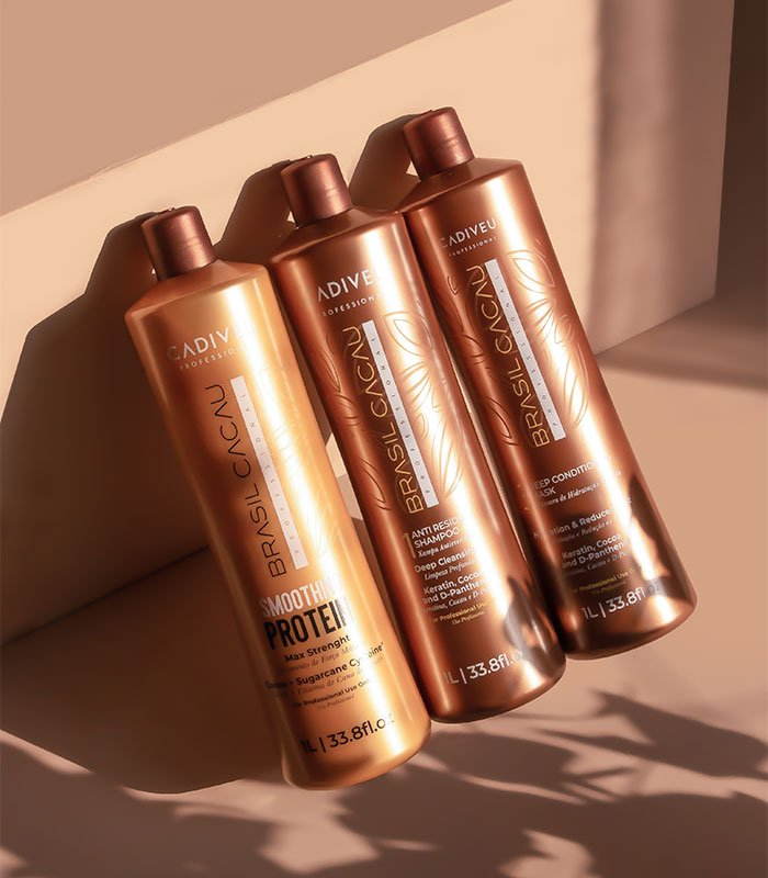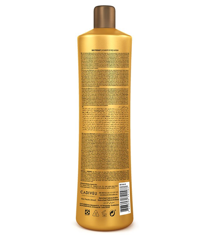 Photograph of a golden bottle of the Cadiveu Brasil Cacau Smoothing Protein product, with a capacity of 1 liter (33.8 fl. oz). The label highlights information such as ‘Max Strength’, ‘Cocoa + Sugarcane Cysteine’, and ‘Professional Use Only’. The design features elegant details with embossed leaf patterns and black and white text for contrast.