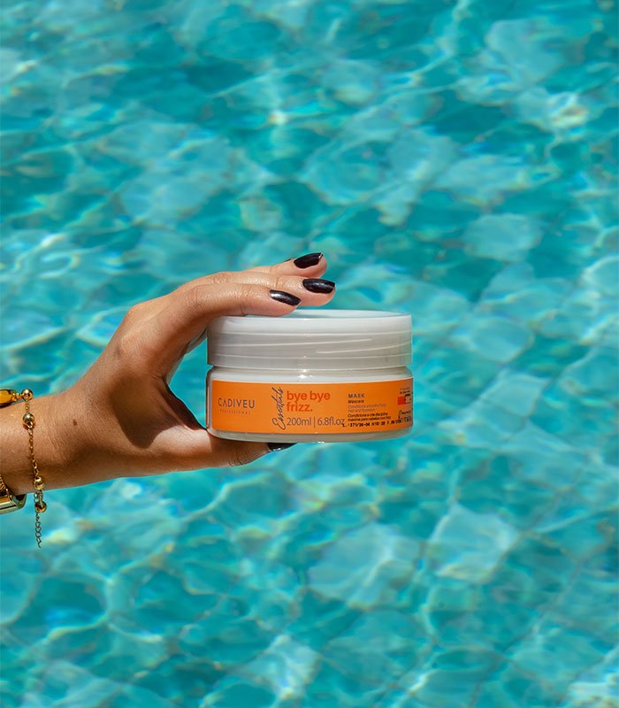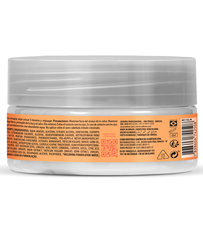 Bye Bye Frizz conditioner mask jar with a formula 95% of natural Cadiveu origin. Orange packaging with information in several languages, highlighting benefits such as deep nourishment, hair discipline, and maximum shine. Manufactured in Brazil and PETA approved.