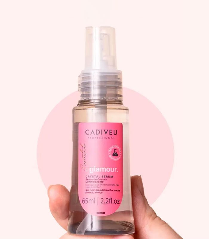 Photograph of a 65ml transparent bottle of Crystal Serum Glamour from Cadiveu Professional. The product has a pink label highlighting its functions, such as sealing cuticles, smoothing hair, and providing thermal protection. The packaging is equipped with a pump to facilitate application.