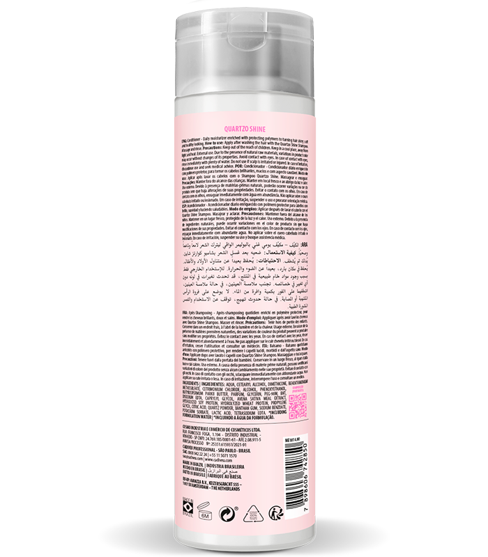 Front image of the Cadiveu Quartzo Shine conditioner packaging. It features a minimalist design in light pink, highlighting the product name and the description ‘Restores shine and nourishes dry and dull hair’, with a capacity of 250ml. It includes the seal of the Essentials line from the Cadiveu Professional brand.