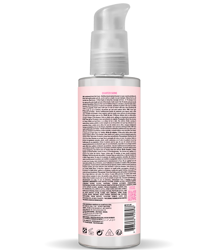 Hair cream bottle from the brand Cadiveu Professional, Quartzo Shine line, with a cylindrical packaging and a dosing cap. The label is light pink with silver details and features information such as ‘Protein Hair Cream’ and ‘200ml | 6.8 fl.oz’. Product indicated for conditioning and nourishing dull hair.