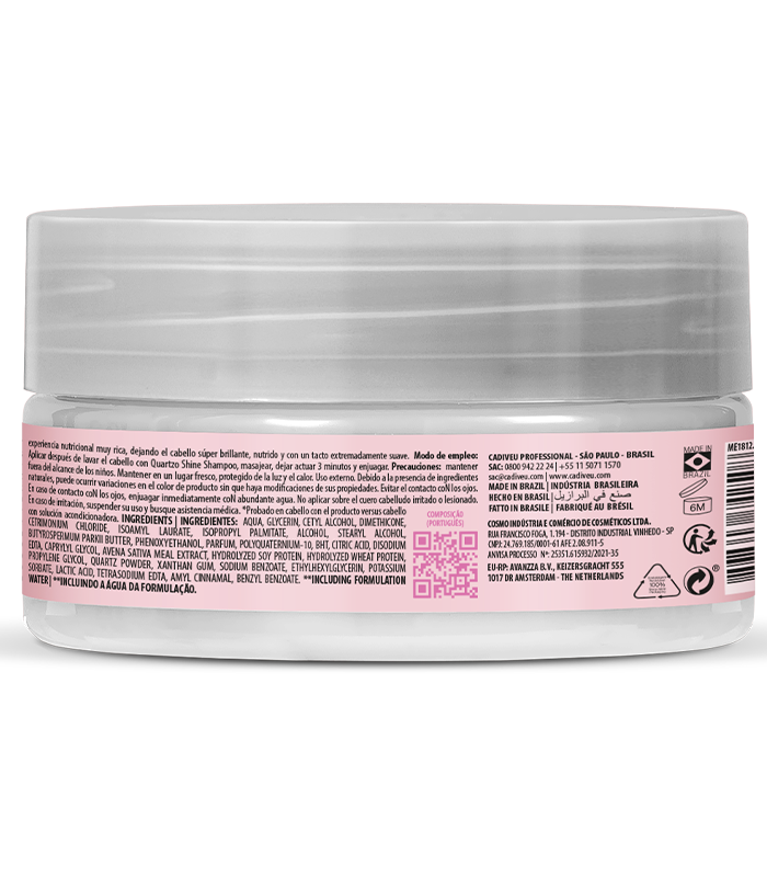 Nourishing mask, its formulation with shea butter and rose quartz offers protection to the threads with antioxidant and anti-drying action, providing a velvety touch and a feeling of emollience to the threads. Immediate result of 5X more shine!