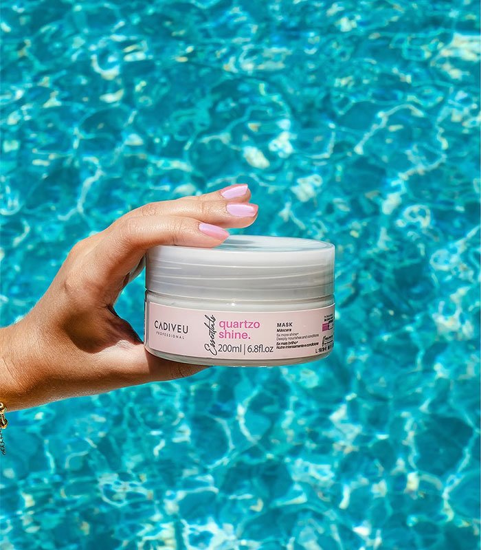 Hair mask pot from the brand Cadiveu Professional, Essentials Quartzo Shine line, with a capacity of 200ml (6.8fl.oz). The label is light pink with white details and black and pink letters. The product promises 5x more shine and intense nourishment for the hair. Transparent packaging with a matte lid.