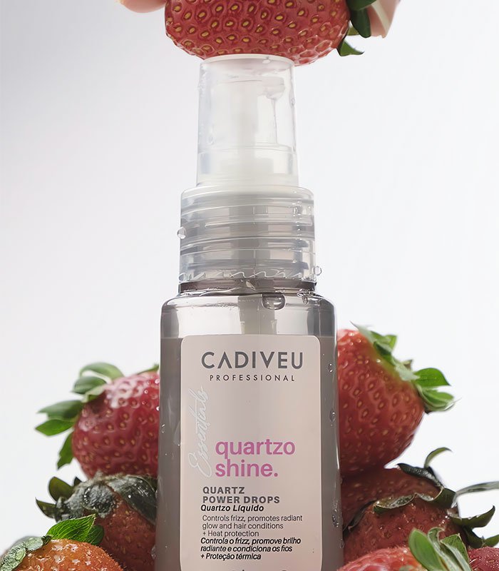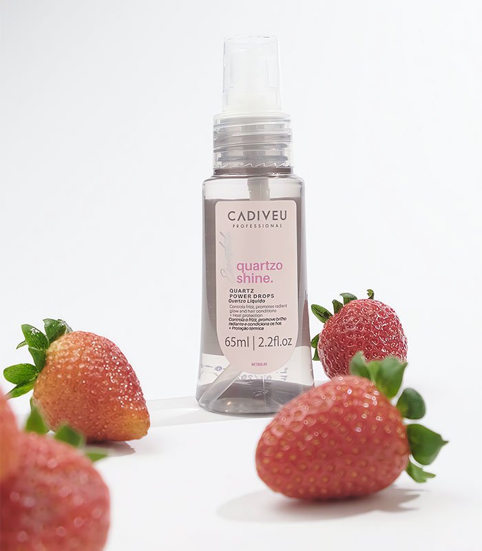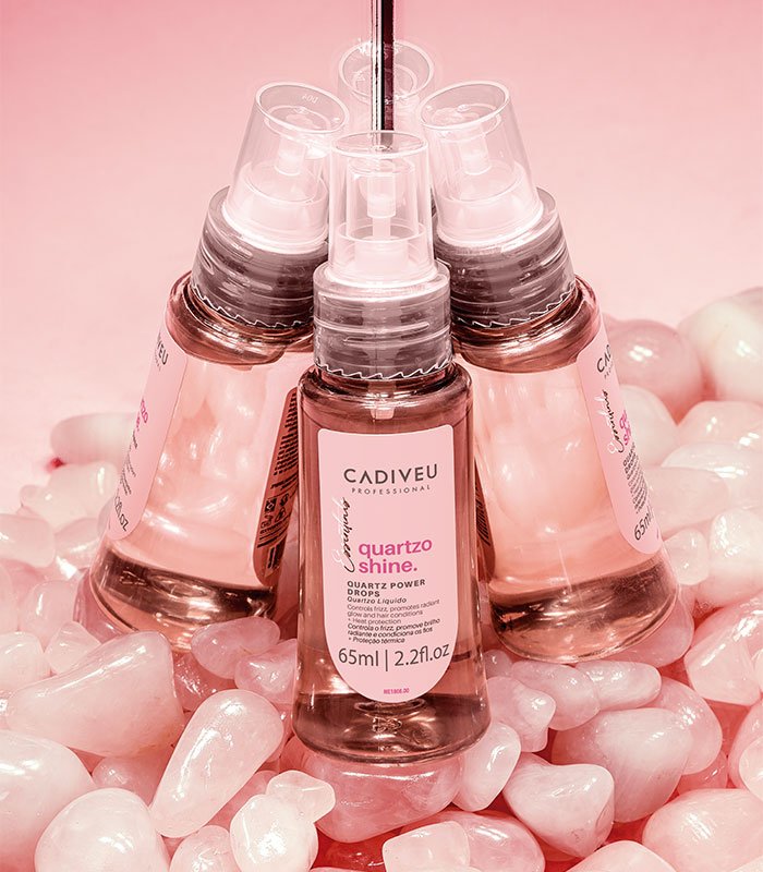 Front of the Quartzo Shine serum by Cadiveu Professional. Promises frizz control, radiant shine, and thermal protection. Modern design in pink with transparent details. Volume of 65ml.